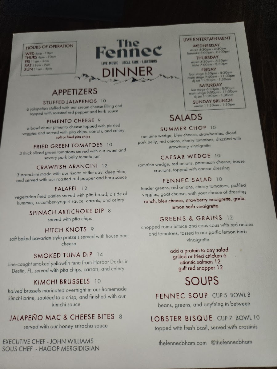Introducing "The Fennec," a vibrant gem nestled in Birmingham, Alabama, at 1630 2nd Ave S. This unique venue is not just a restaurant; it’s a versatile dining experience perfect for both casual lunches and special events. With a menu praised for its delicious offerings, highlights include tantalizing crab cakes, perfectly seasoned Panhandle Tacos, and the fan-favorite crispy Brussels sprouts that have earned their place among the top dishes in the city.